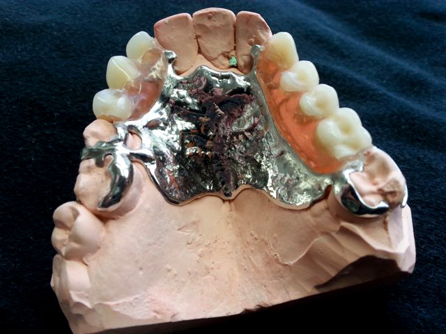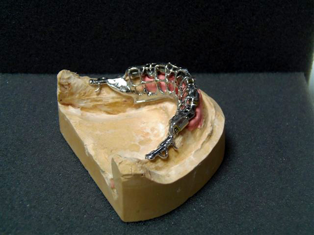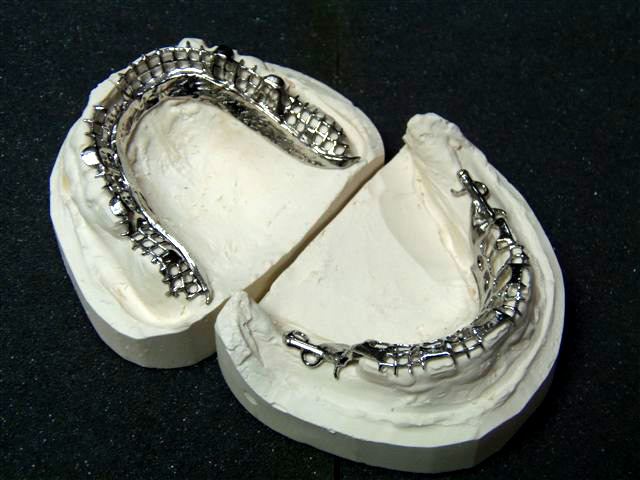 Il se compose d’une plaque métallique réduite avec des crochets très élaborés, et d'une partie en résine qui soutient les fausses dents.Le stellite est confectionné avec un alliage à base de cobalt, biocompatible, ayant une bonne résistance à la corrosion. Il est plus léger que l'appareil en résine. Il s’intègre parfaitement et présente une grande stabilité. Dans certains cas, des attachements de précision non visibles(boutons pressions, taquets, glissières) peuvent remplacer des crochets inesthétiques.