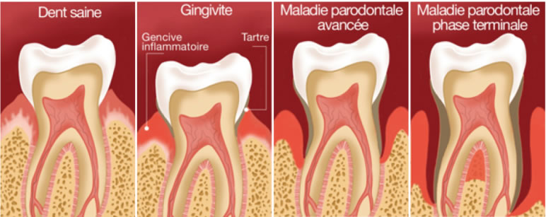 Les maladies parodontales sont des atteintes des tissus de soutien de la dent. On parle de maladie parodontale lorsque la gencive, le ligament alvéolo-dentaire et/ou l’os entourant la dent sont atteints par une inflammation ou une infection. La gencive est le tissu mou de couleur rose qui entoure les dents. Lorsqu’elle subit une agression (infection, présence de tartre, ...) la « gingivite » s’installe.