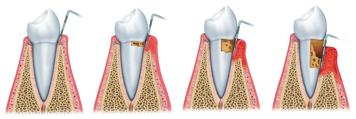 La parodontite correspond à une perte progressive de l’os alvéolaire autour des dents. Si elle n’est pas traitée à temps, les dents commencent à bouger progressivement ; on observe alors une récession gingivale (déchaussement des dents) qui peut déboucher sur une perte de dents.